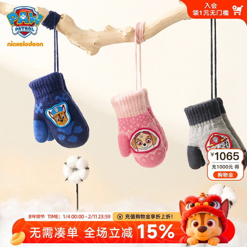 汪汪队儿童手套秋冬季连指加绒加厚挂绳包指男童女童宝宝挂脖手套