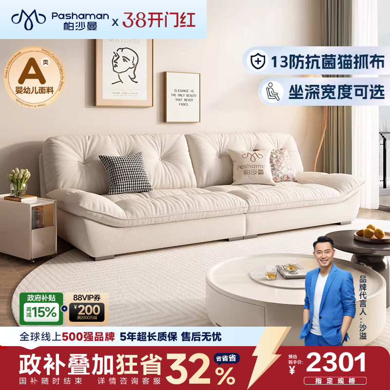 帕沙曼云朵沙发客厅现代简约小户型直排奶油风布艺沙发猫抓布抗菌