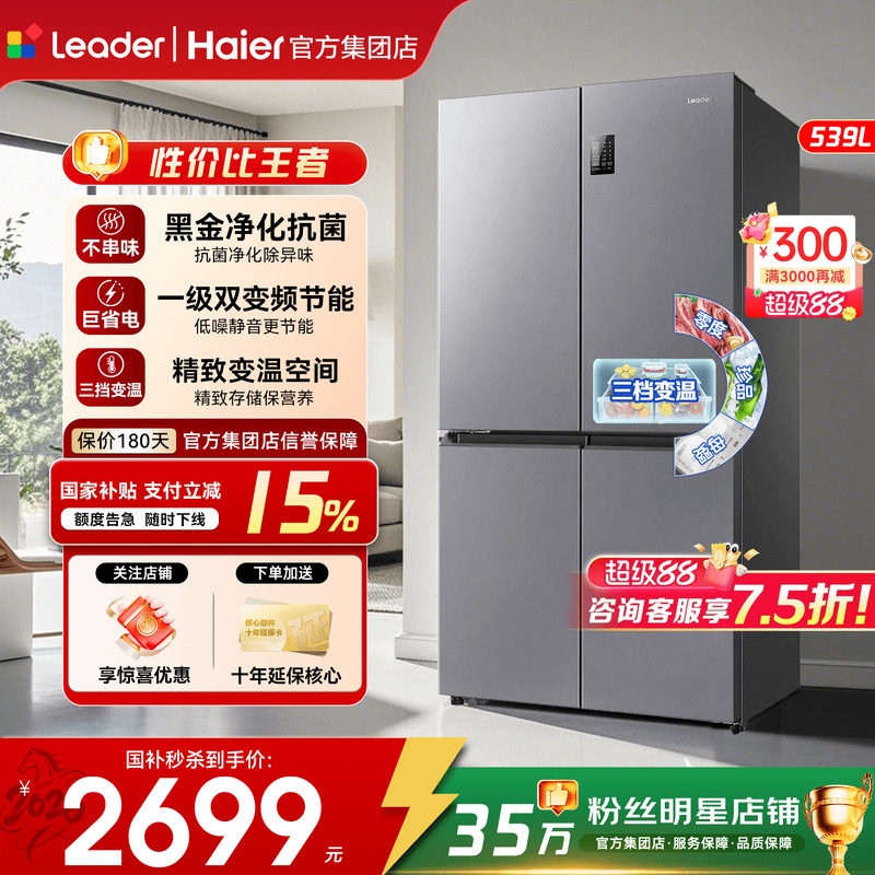 国补15%]海尔冰箱539L升超大容量统帅家用一级变频十字四门旗舰店