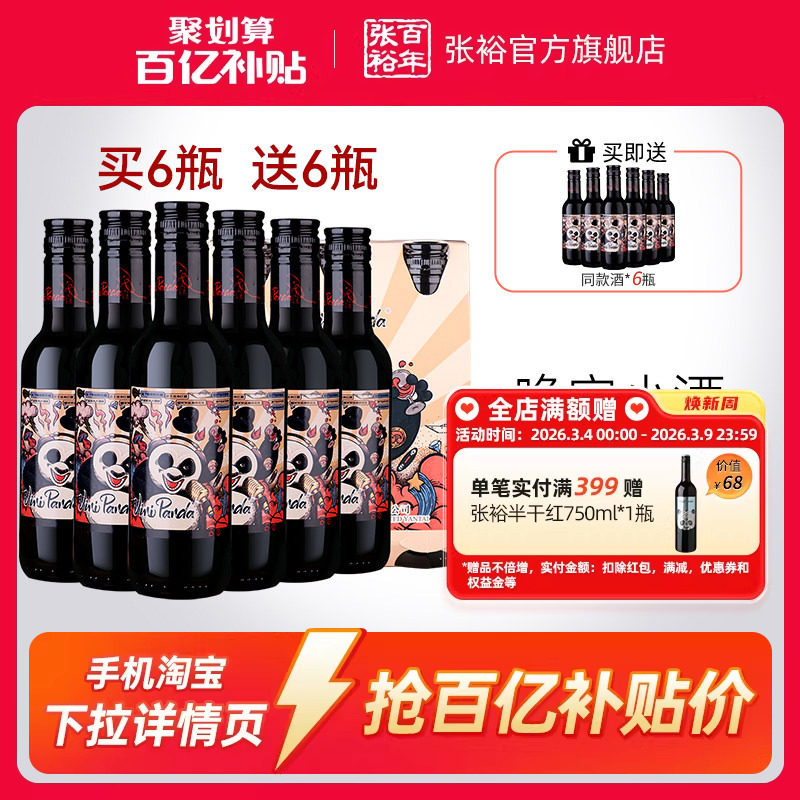 【百补】张裕官方 熊猫赤霞珠半干红葡萄酒188ml晚安小瓶酒
