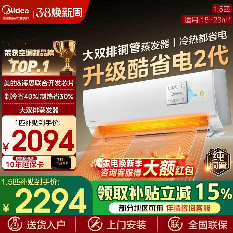 美的空调一级能效家用大1.5匹变频冷暖挂机官方2026款酷省电二代