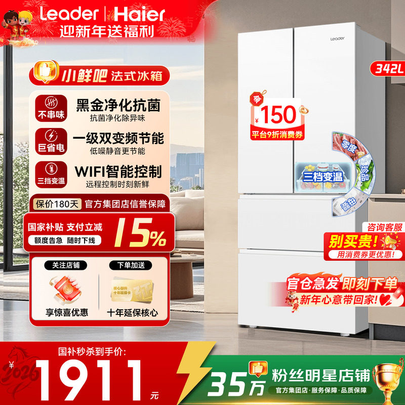 国补15%]海尔电冰箱342L家用法式四门统帅一级能效变频无霜旗舰店