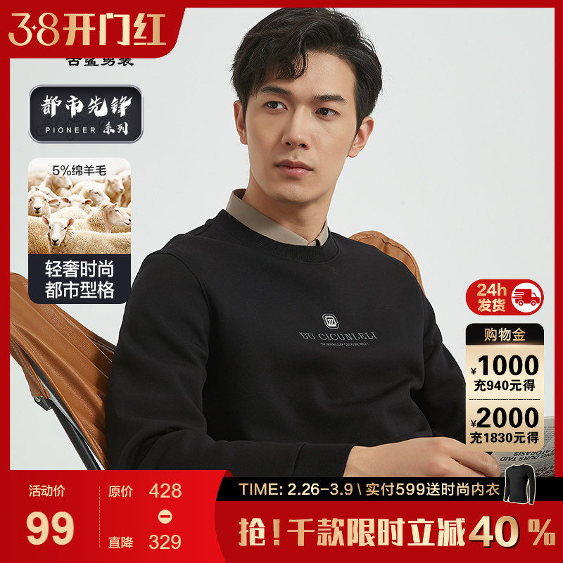 【绵羊毛卫衣】古鲨黑色长袖T恤男轻奢简约圆领修身休闲春装新