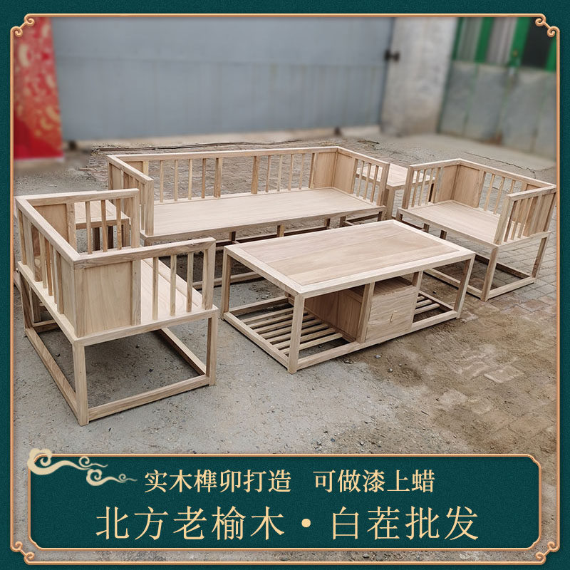 新中式全实木沙发客厅原木组合六件套简约北方老榆木民宿家具白胚
