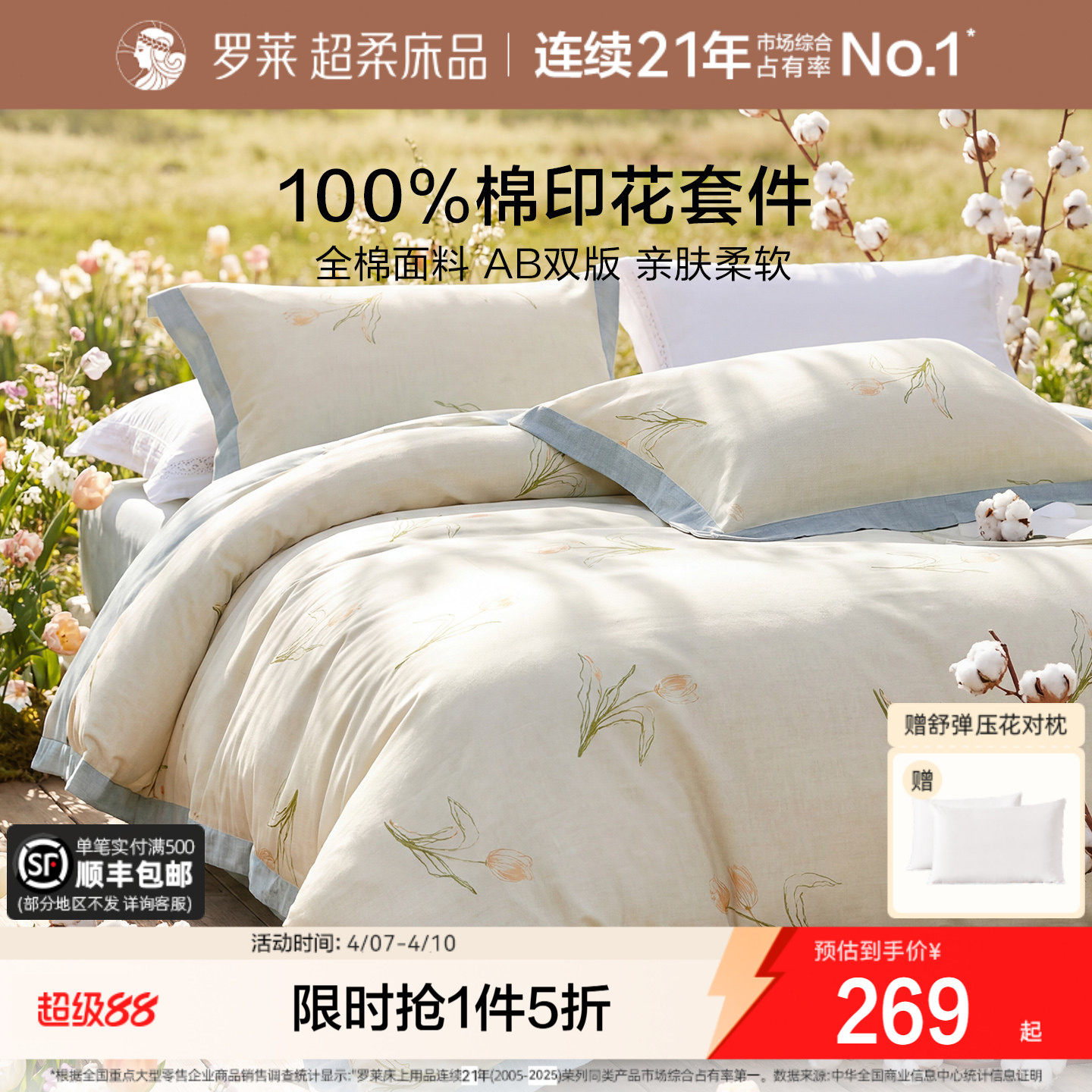 罗莱家纺床上四件套全棉纯棉被套床单床笠被罩双人棉套件宿舍
