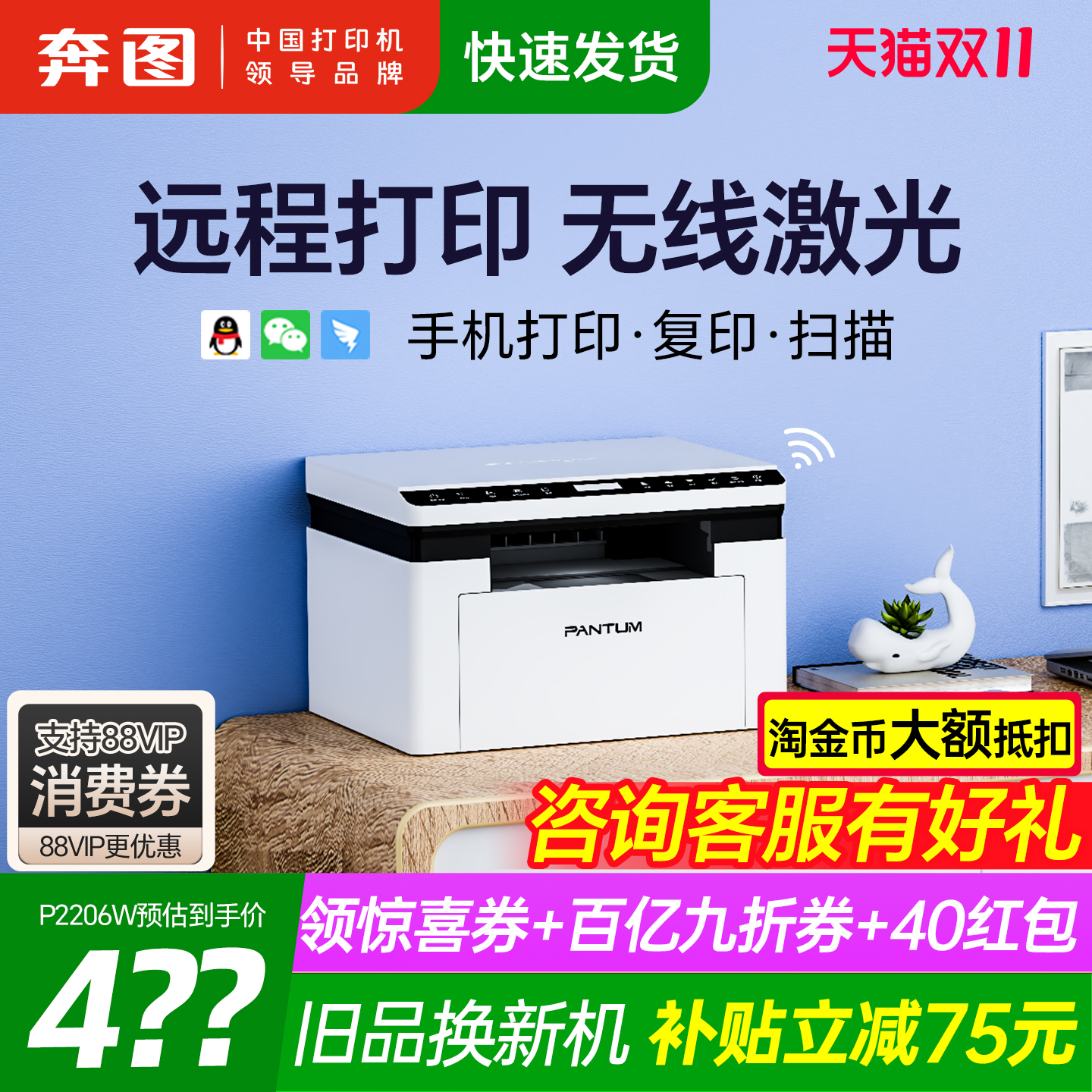 奔图旗舰店bm2303w黑白激光打印机复印扫描一体机手机无线学生家用小型家庭作业