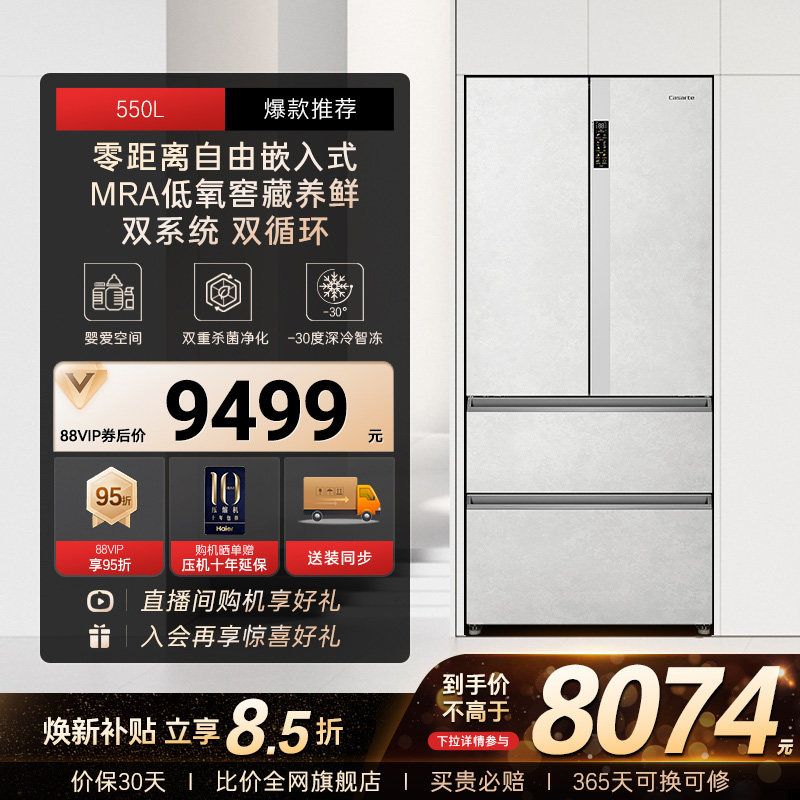 以旧换新补贴卡萨帝揽光550L大容量零嵌入式法式多门家用电冰箱