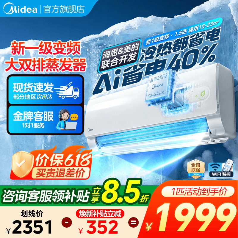美的空调新一级变频大1.5匹1P家用冷暖酷省电二代挂机官方旗舰店