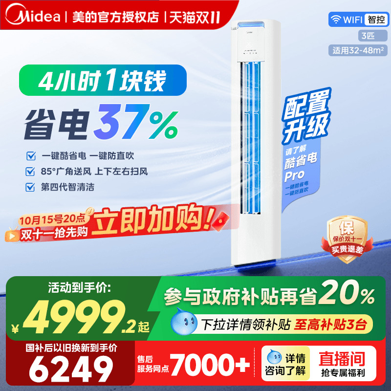 【政府补贴】美的空调酷省电3匹2匹柜机立式一级能效变频冷暖家用
