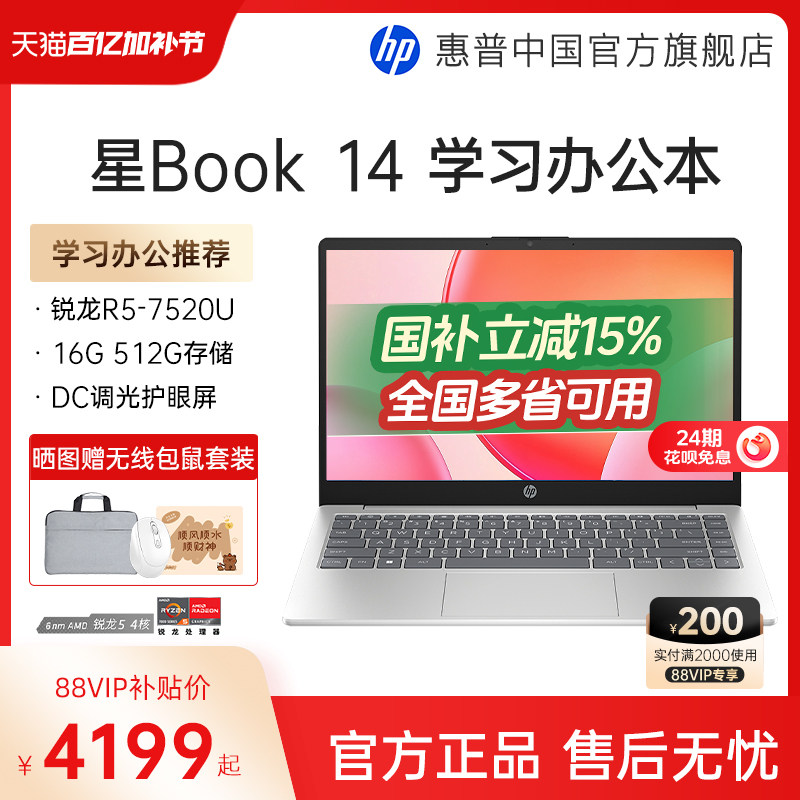 【24期免息&国家补贴15%】HP/惠普可选星book 14 锐龙 5 7520