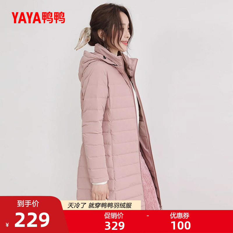 鸭鸭轻薄款羽绒服女2025冬季新品中长款时尚轻型保暖连帽鸭绒外套