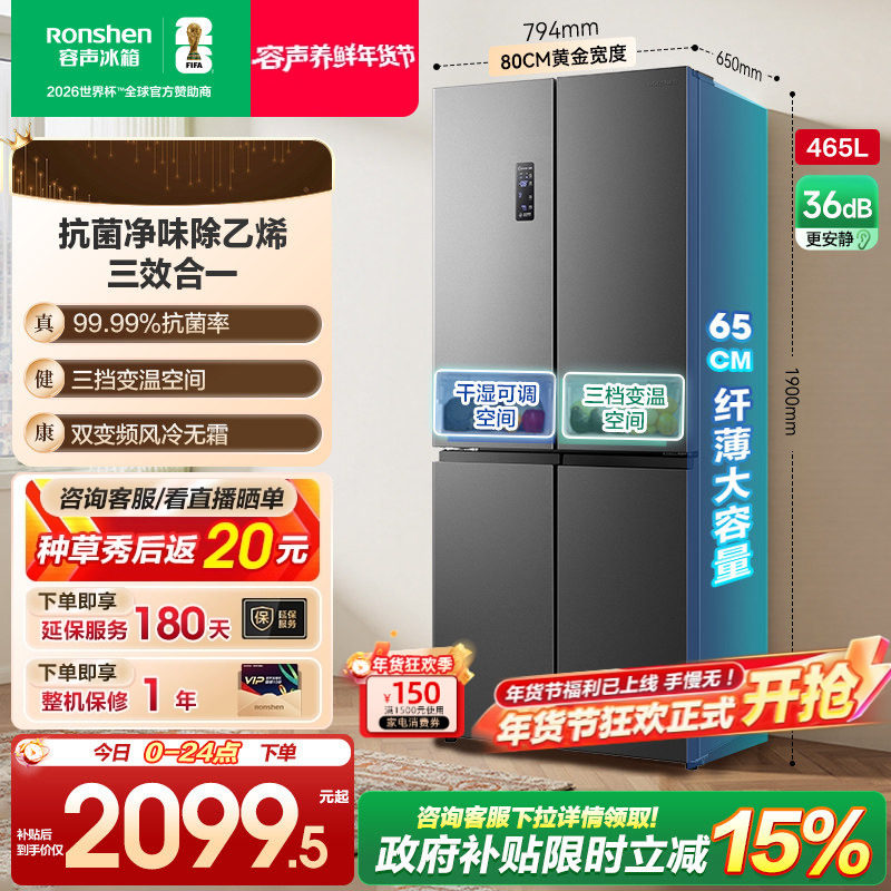 容声465L十字双开四门大容量一级风冷无霜薄嵌入家用冰箱换新补贴