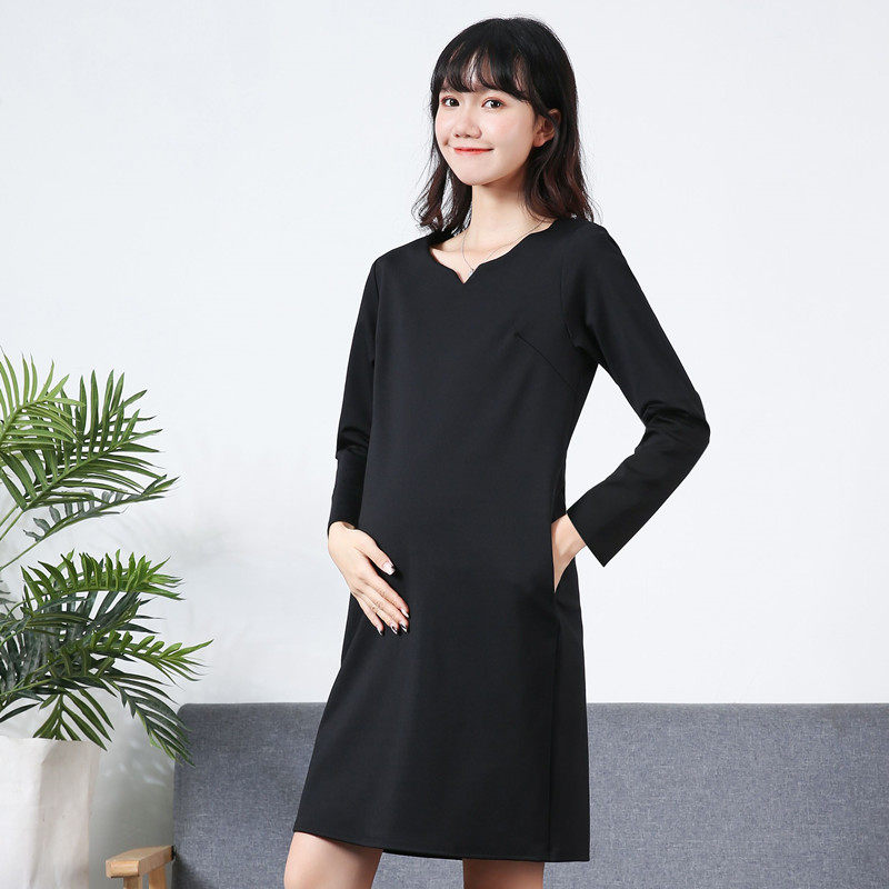 2025新款孕妇秋冬V领职业连衣裙显瘦通勤时尚纯棉长袖简约工作服