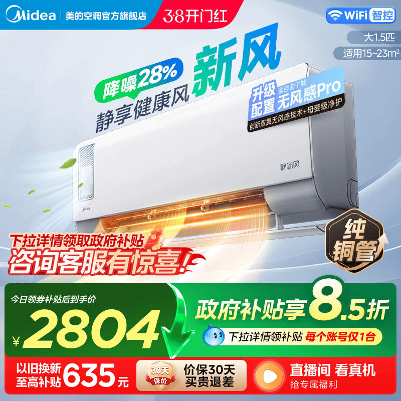美的静新风空调1.5匹一级变频卧室家用挂机冷暖两用除湿自清洁