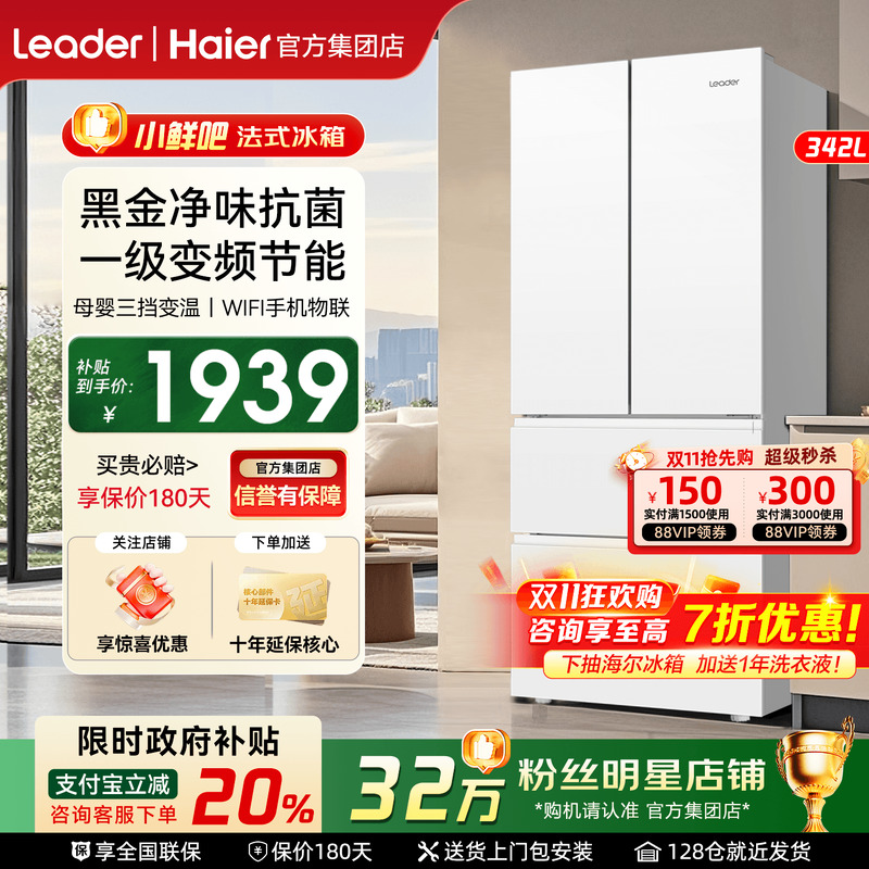 国补20%]海尔电冰箱342L家用法式四开门统帅一级能效变频无霜旗舰
