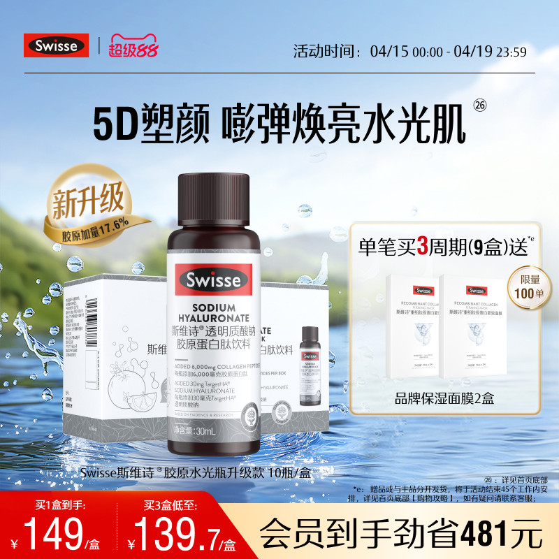 • 泡美丽»»Swisse斯维诗胶原水光瓶胶原蛋白肽口服液专利玻尿酸烟酰胺虾青素