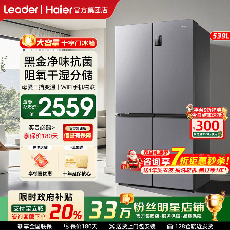 国补20%]海尔冰箱539L升超大容量统帅家用一级变频十字四门旗舰店