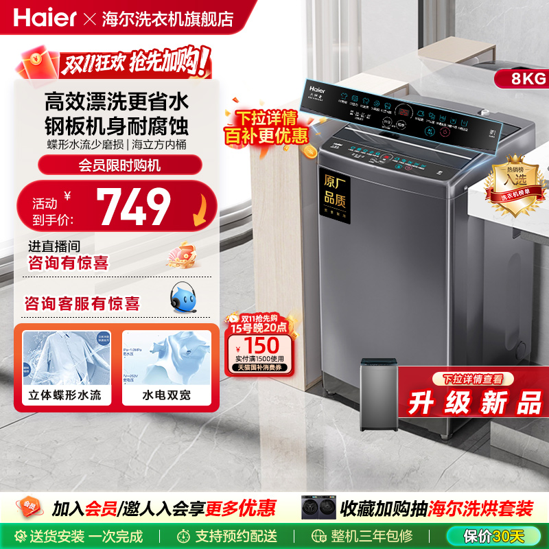 海尔官方旗舰波轮洗衣机8kg全自动家用大容量洗脱一体租房用Mate1