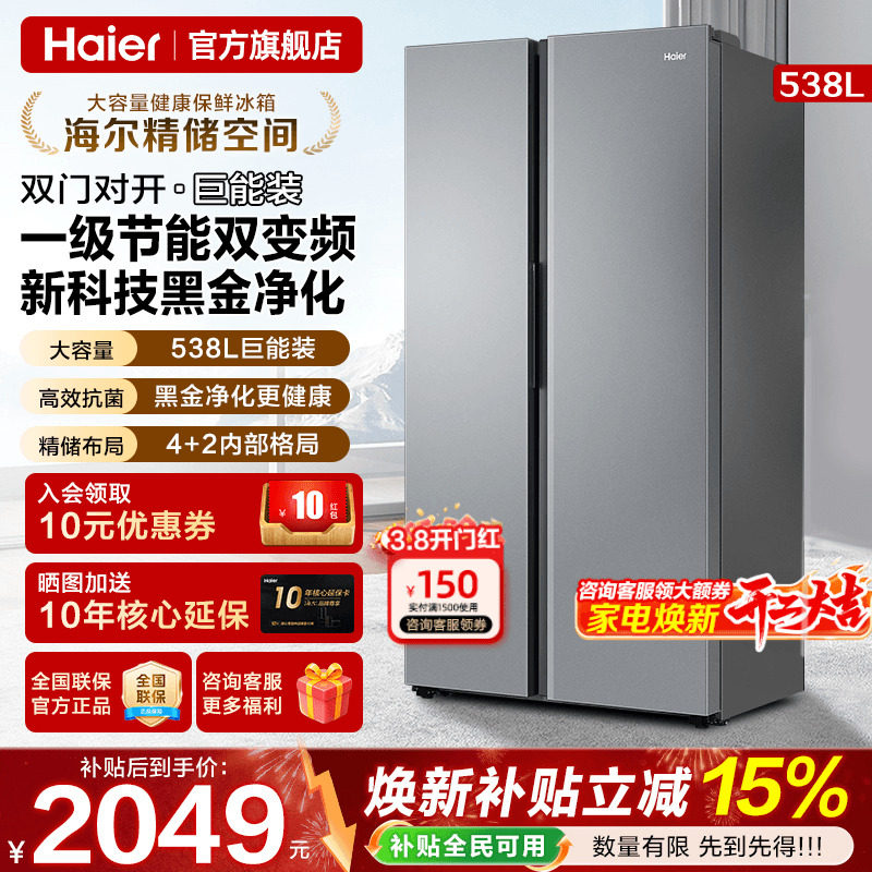 海尔电冰箱538L双门大容量两门对开门一级能效家用风冷无霜旗舰店
