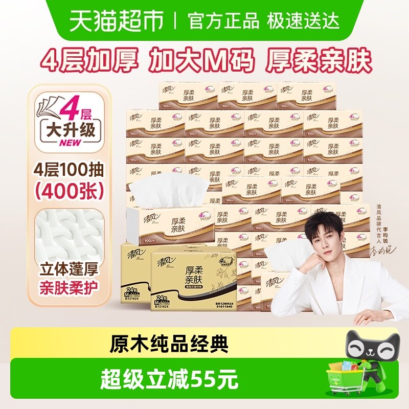 【李昀锐同款】下拉享优惠清风抽纸原木厚柔4层100抽48包