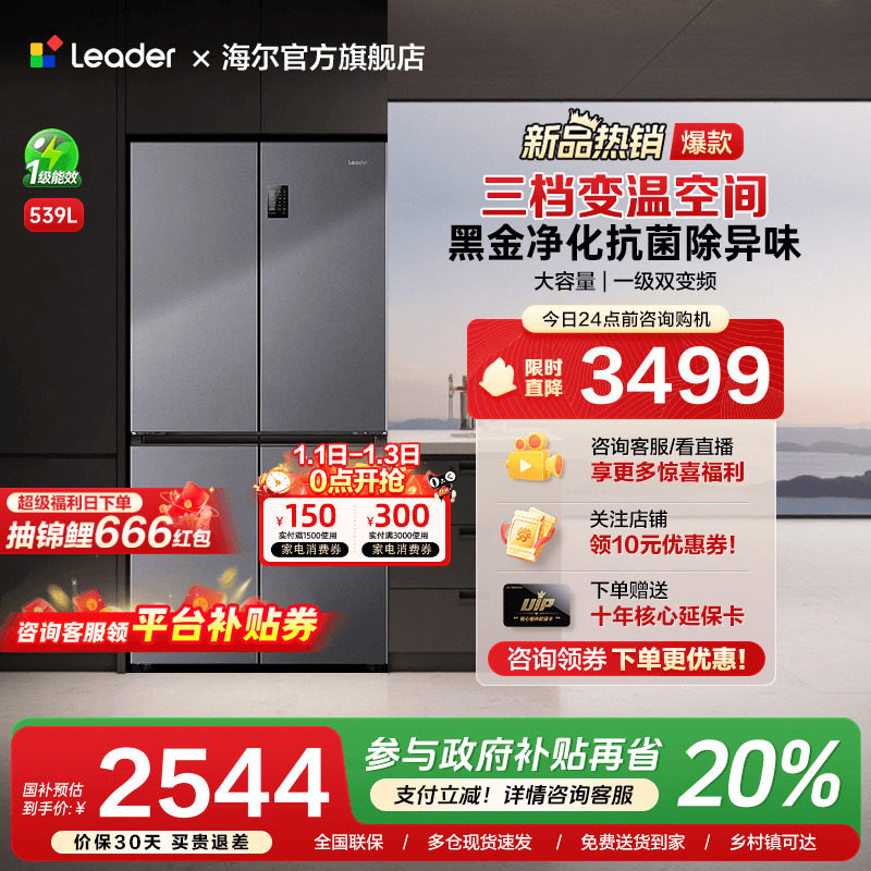 海尔出品统帅539L十字对开四门家用一级能效变频无霜大容量电冰箱
