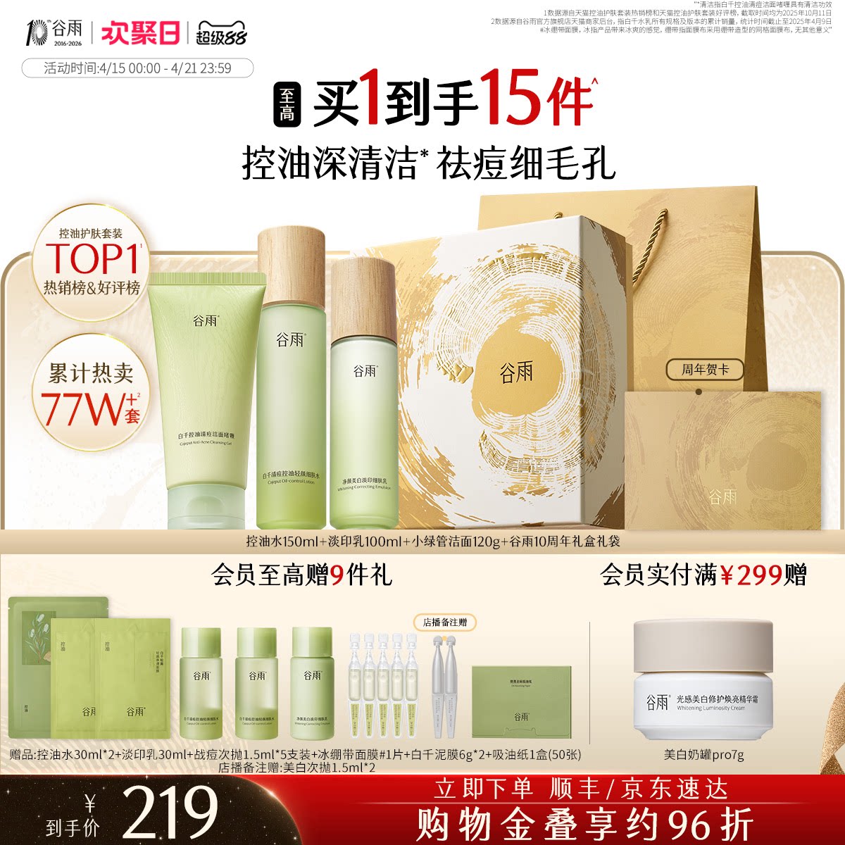 谷雨白千控油水乳套装祛痘淡化痘印收缩毛孔敏感肌油皮清爽护肤品