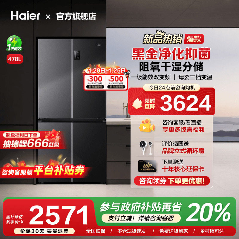 [换新补贴]海尔478L四门十字双对开门家用变频一级能效无霜电冰箱