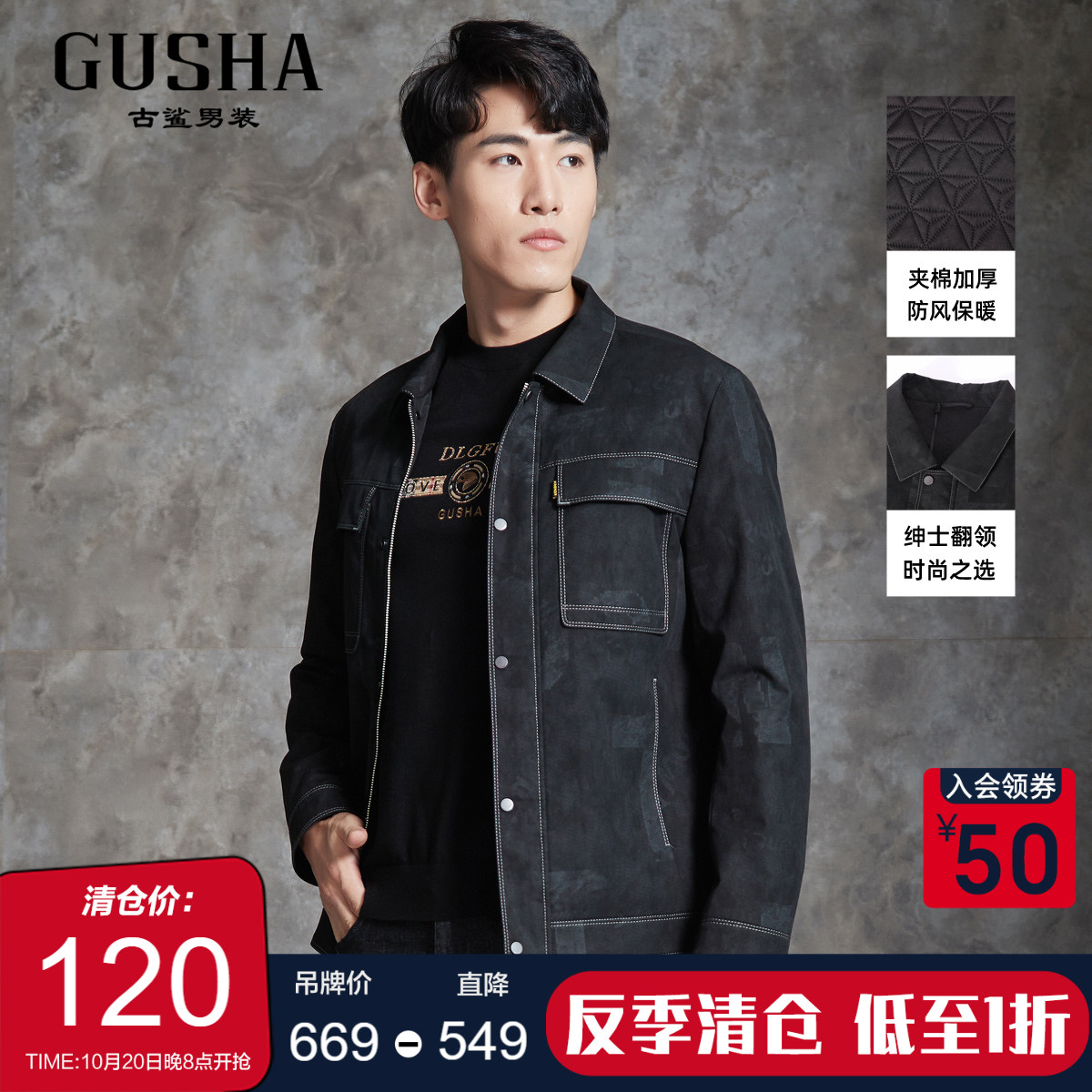 【清仓】古鲨黑色图案印花牛仔夹克男翻领夹棉保暖外套冬季新