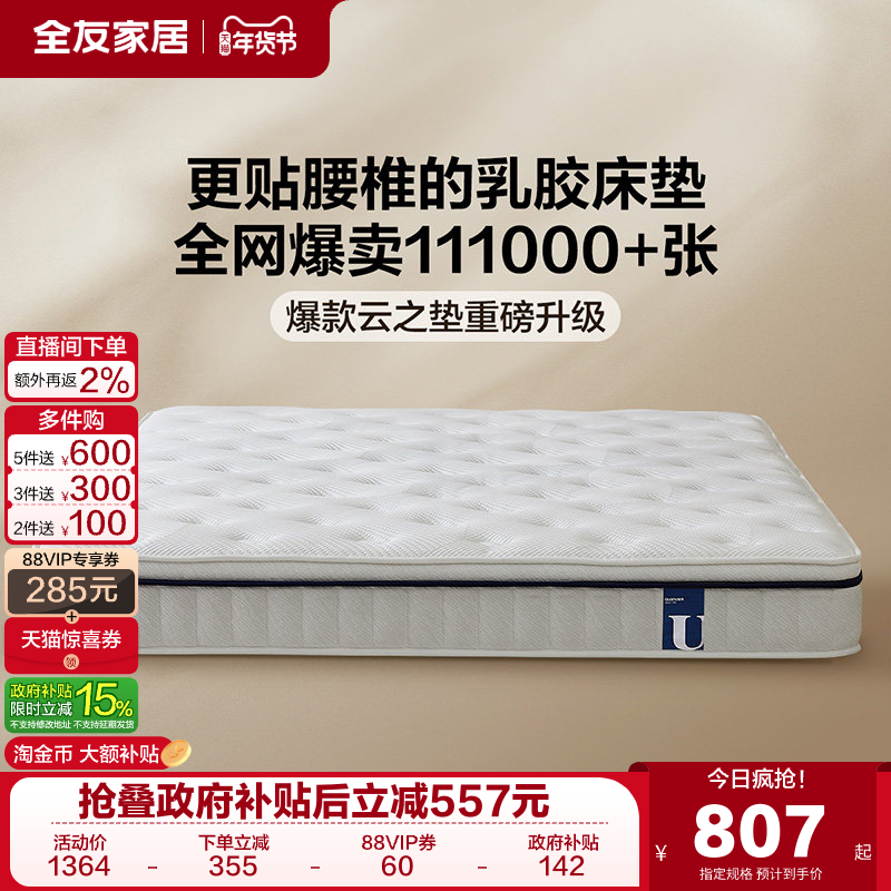 全友家居软硬适中双面乳胶床垫家用卧室双人椰棕床垫酒店席梦思