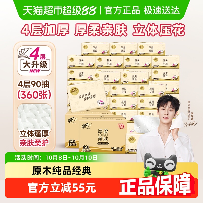【李昀锐同款】下拉享优惠清风抽纸原木厚柔4层90抽48包
