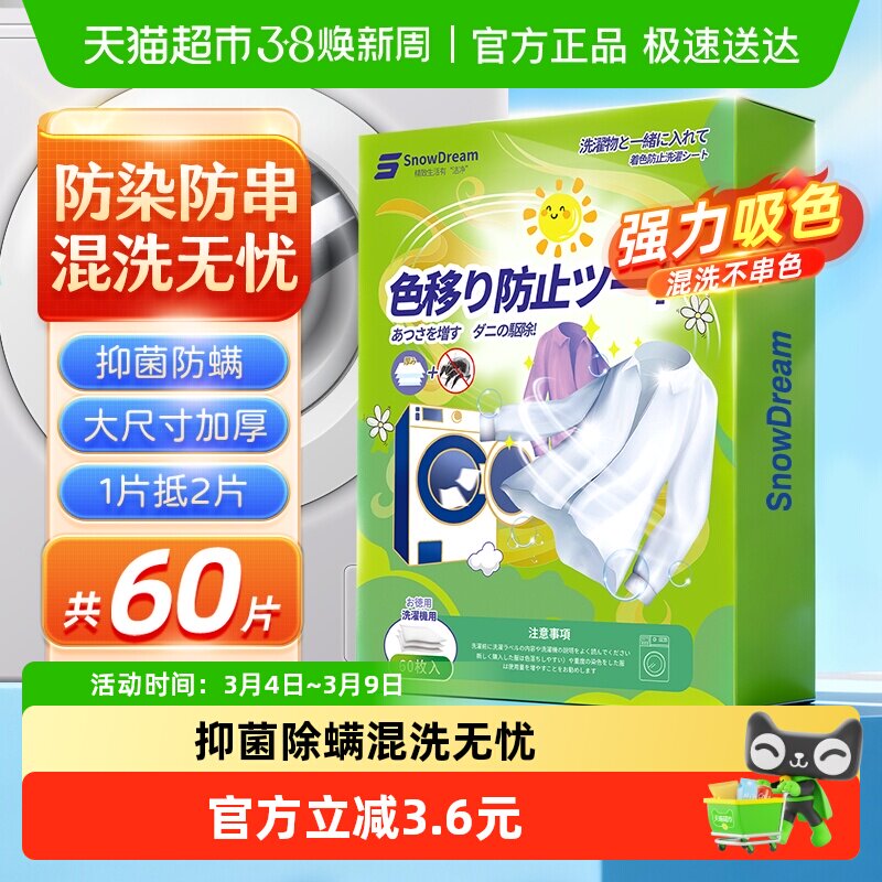 SnowDream吸色片防串色染色60片抑菌除螨洗衣色母片吸色纸
