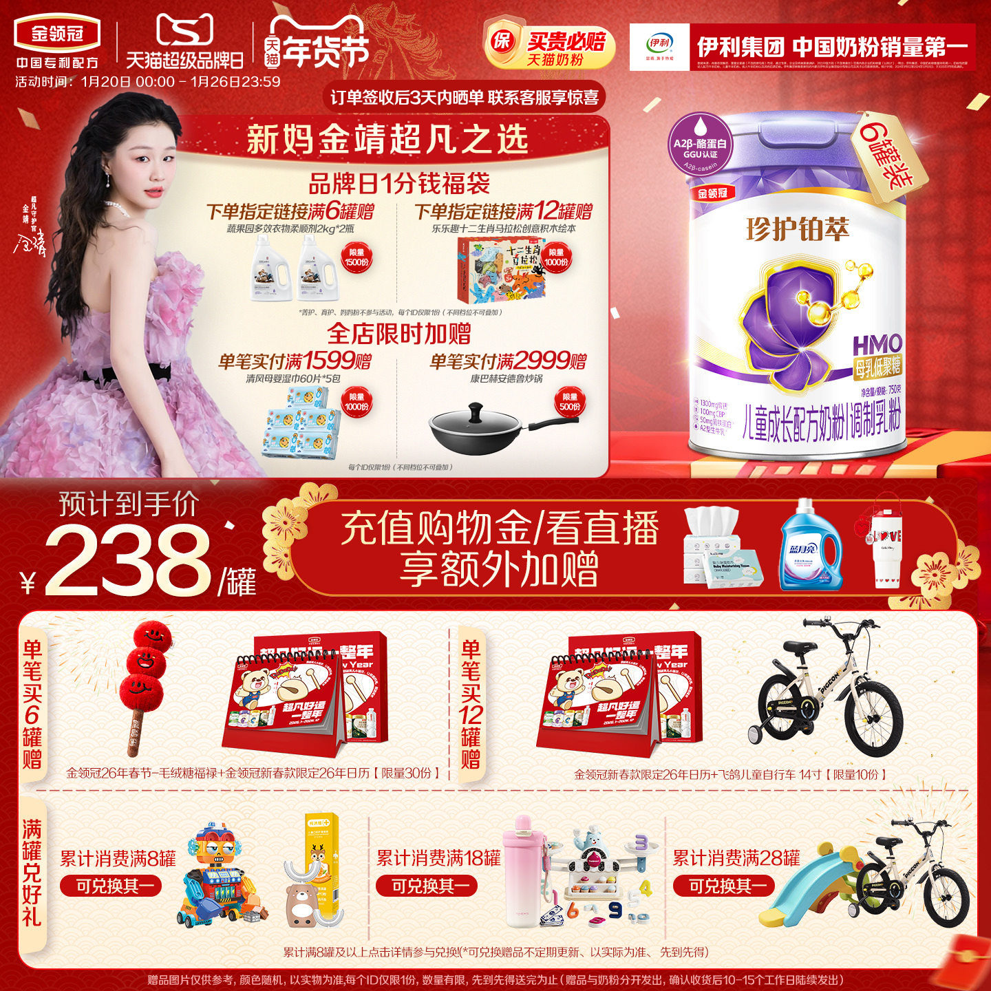 【全面营养】伊利金领冠珍护铂萃4段3岁以上儿童成长牛奶粉750g*6