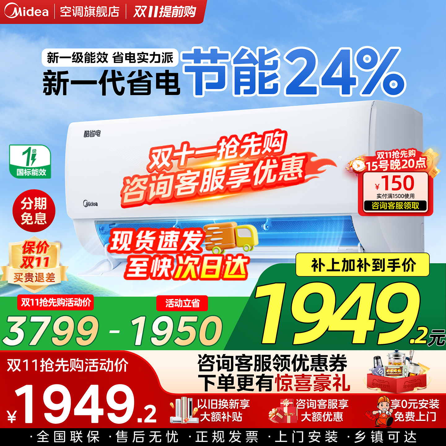 美的空调酷省电大1P1.5匹一级能效家用变频挂机官方旗舰店正品