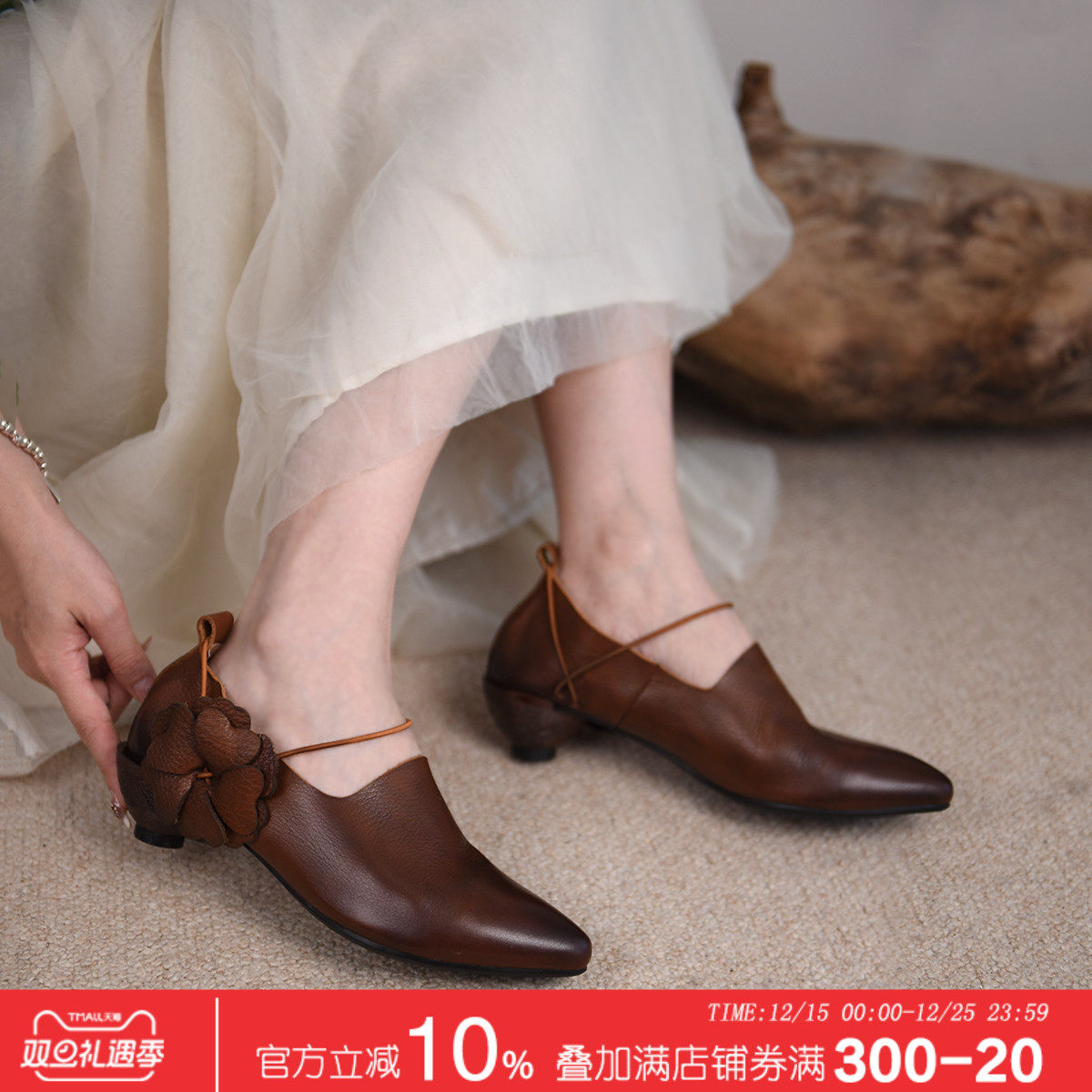 Artmu阿木原创复古真皮花朵尖头单鞋粗跟女鞋高跟鞋子2025新款