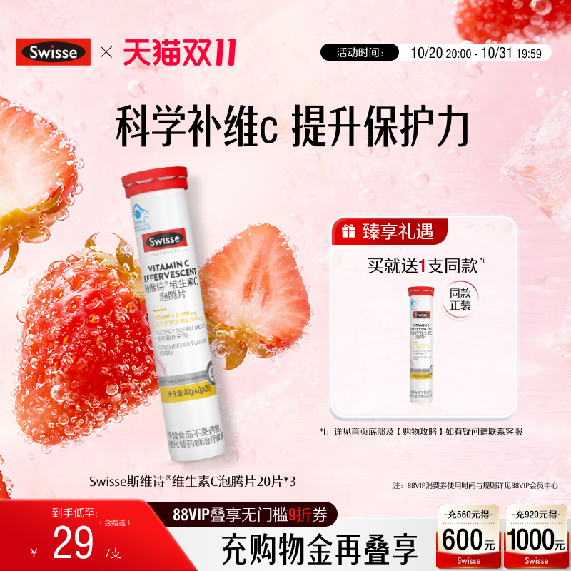 Swisse斯维诗维生素C泡腾片高浓度维C草莓味提升自护力官方正品