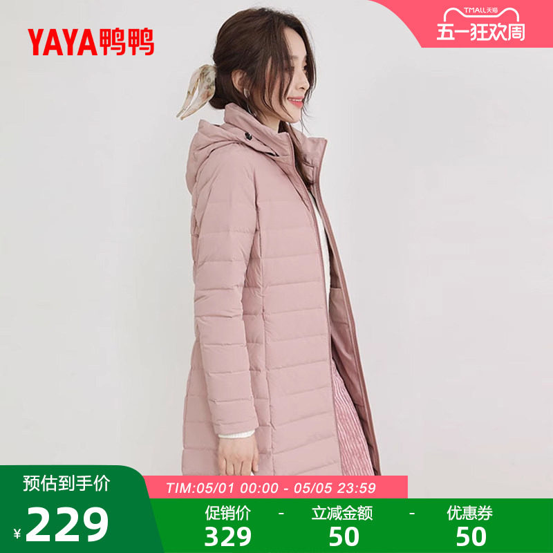 鸭鸭轻薄款羽绒服女2025冬季新品中长款时尚轻型保暖连帽鸭绒外套