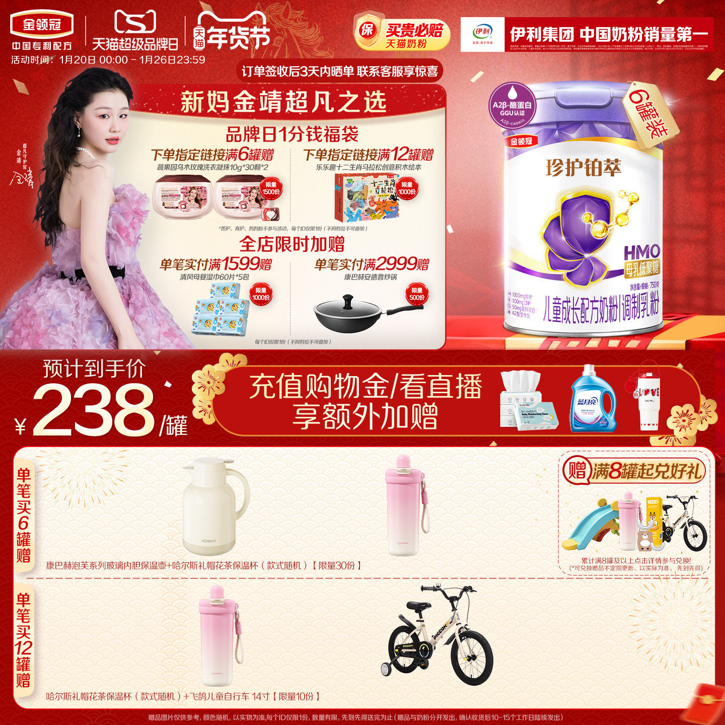 【全面营养】伊利金领冠珍护铂萃4段3岁以上儿童成长牛奶粉750g*6