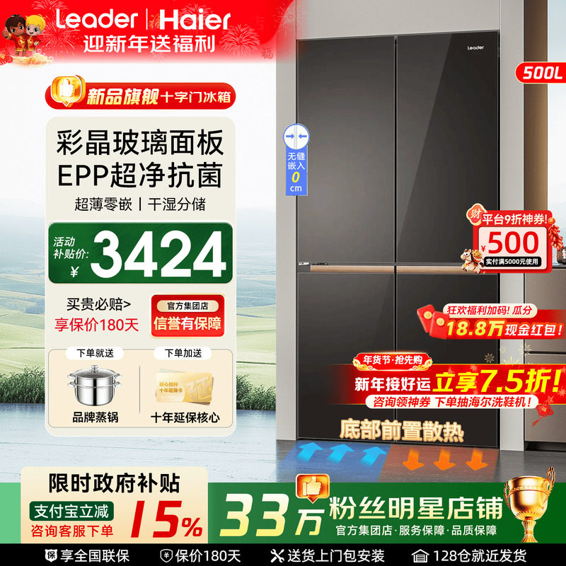 【补贴15%】海尔冰箱500L家用十字四门多门统帅529超薄零嵌旗舰店