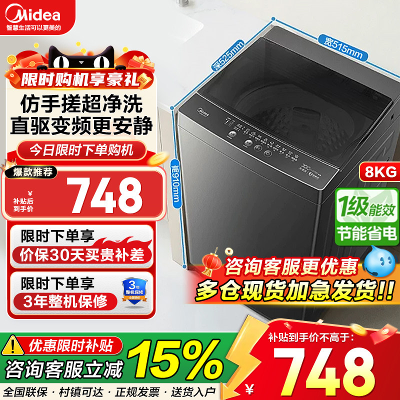 • 泡美丽»»美的8KG波轮洗衣机直驱变频全自动家用租房抗菌除螨洗脱一体56DT