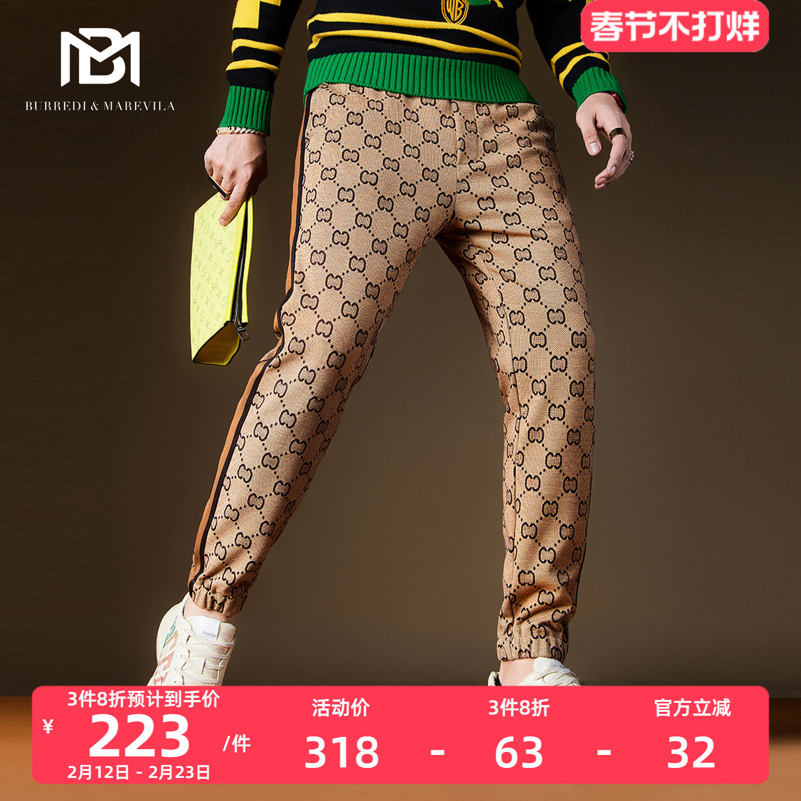 BM男士休闲裤秋冬款2022欧货新款男裤子高街满花潮牌束脚重磅卫裤