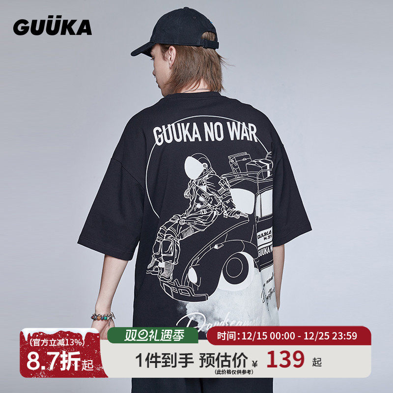 GUUKA潮牌黑色短袖T恤男夏情侣嘻哈后背宇航员印花运动五分袖宽松