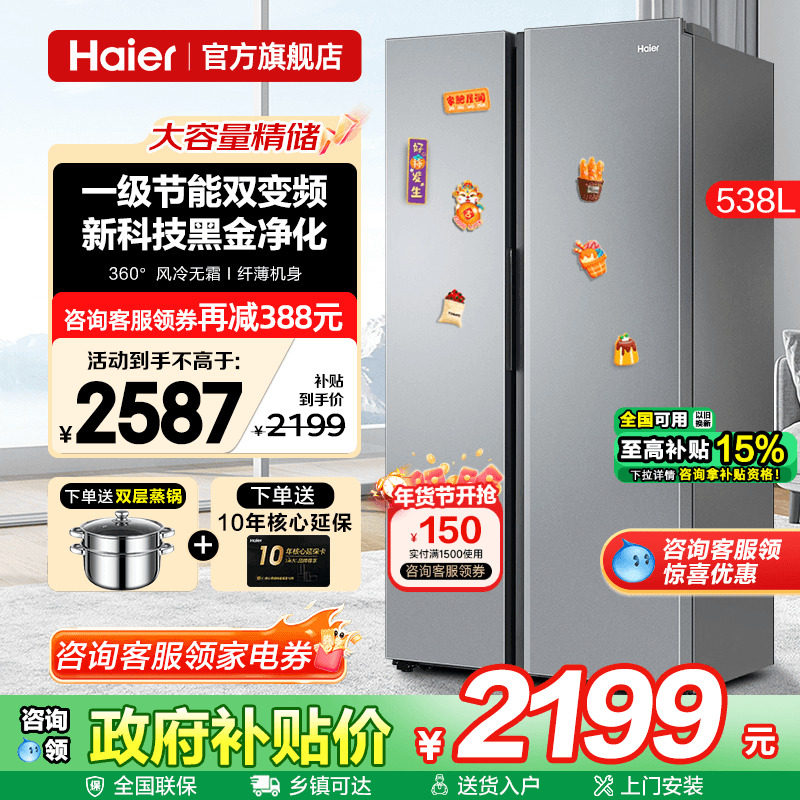 海尔电冰箱538L双门大容量两门对开门一级能效家用风冷无霜旗舰店