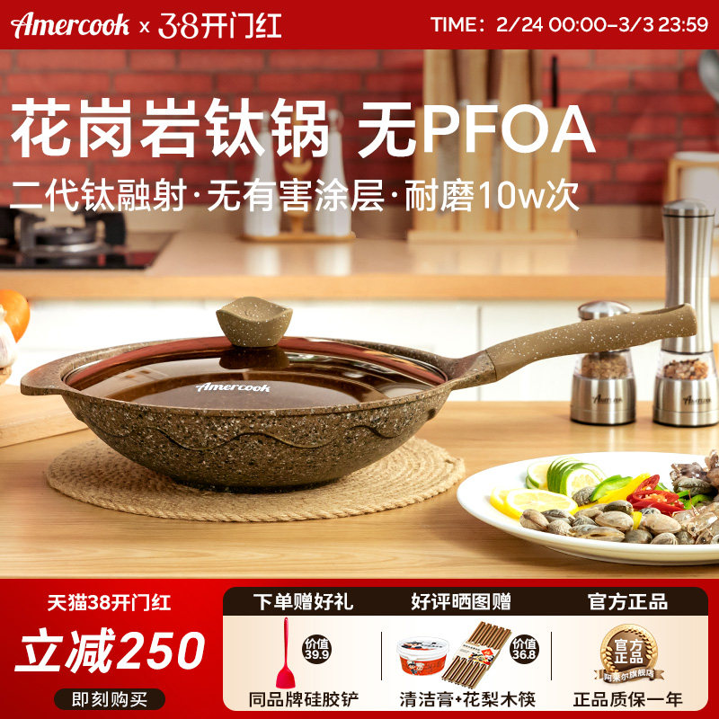 amercook阿尔菲塔麦饭石花岗岩钛炒锅不粘锅家用炒菜锅燃气电磁炉