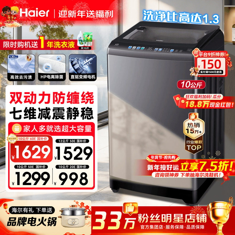 【手搓洗防缠绕】海尔洗衣机60E家用10kg全自动直驱波轮50E旗舰店