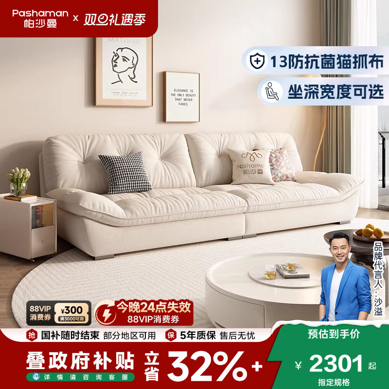 帕沙曼云朵沙发客厅现代简约小户型直排奶油风布艺沙发猫抓布抗菌