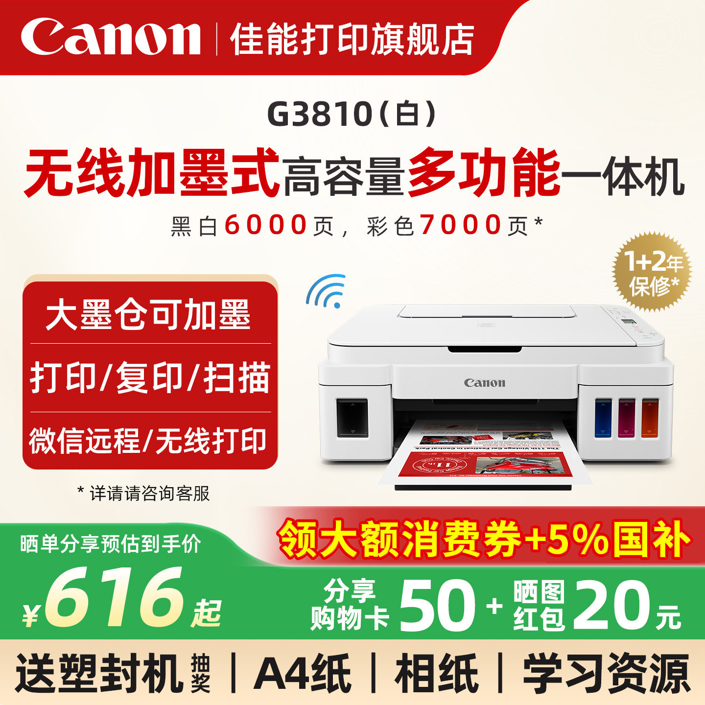 佳能G3810w无线家用小型打印机可连手机连供墨仓式彩色喷墨复印扫描一体机wif